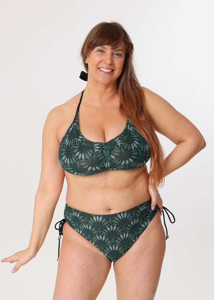 Bikintruser i grønt og svart mønster. En truse med høyt liv som er bredere i sidene. Ved hjelp av lissene på sidene kan du bestemme hvor høyt snitt du vil at trusen skal ha. Trusen er sydd med en scrunch butt, som gjør at stoffet er rynket bak uten å skjære inn. Scrunchen fremhever kurvene dine på en god og attraktiv måte.